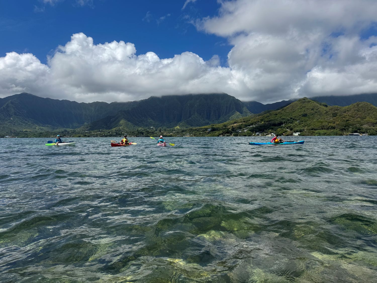 Several paddlers had perfect weather for their trek to Turtletown on the last day of the fishing tournament campout. Some were campers and others came in for the day. Jled, our resident teenager, joined the fray to ace his very first solo paddle. Leader Eileen Helmstetter was upbeat and prepared. There is no finer sight than kayaks of many colors against the backdrop of beautiful Kaneohe bay!